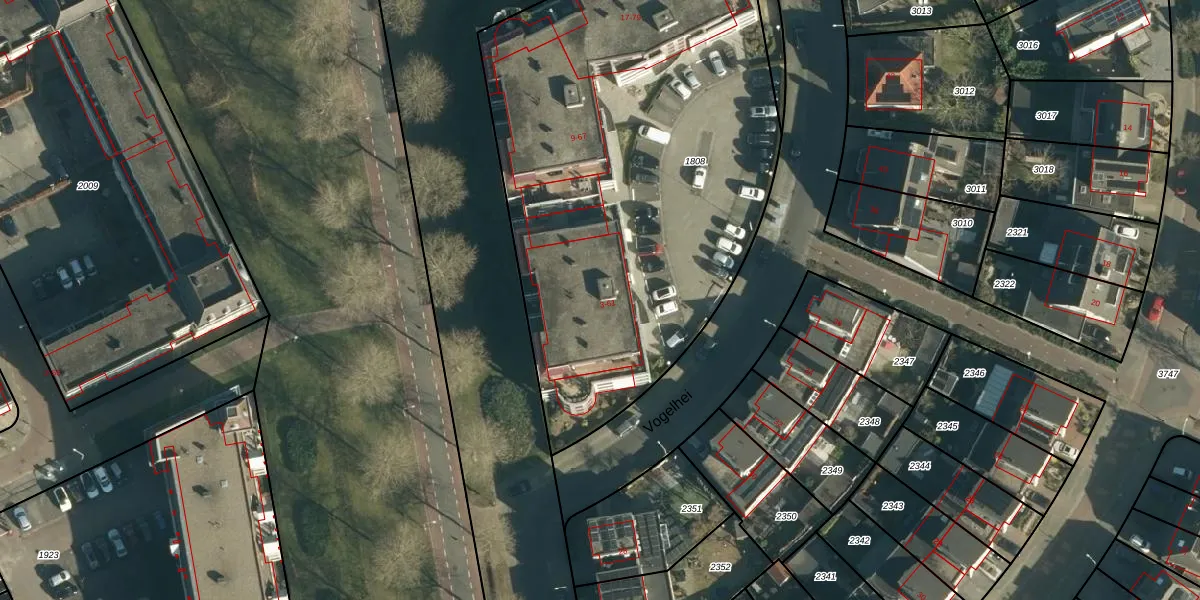 Het perceel waarop Vogelhei 57 staat heeft een oppervlakte van 2954 m². Dit is een zeer groot perceel. De perceeloppervlakte wordt geregistreerd door het Kadaster. Gedetailleerde informatie over de maten van dit perceel kunt u vinden in het rapport Kadastrale kaart met maatvoering van Vogelhei 57.