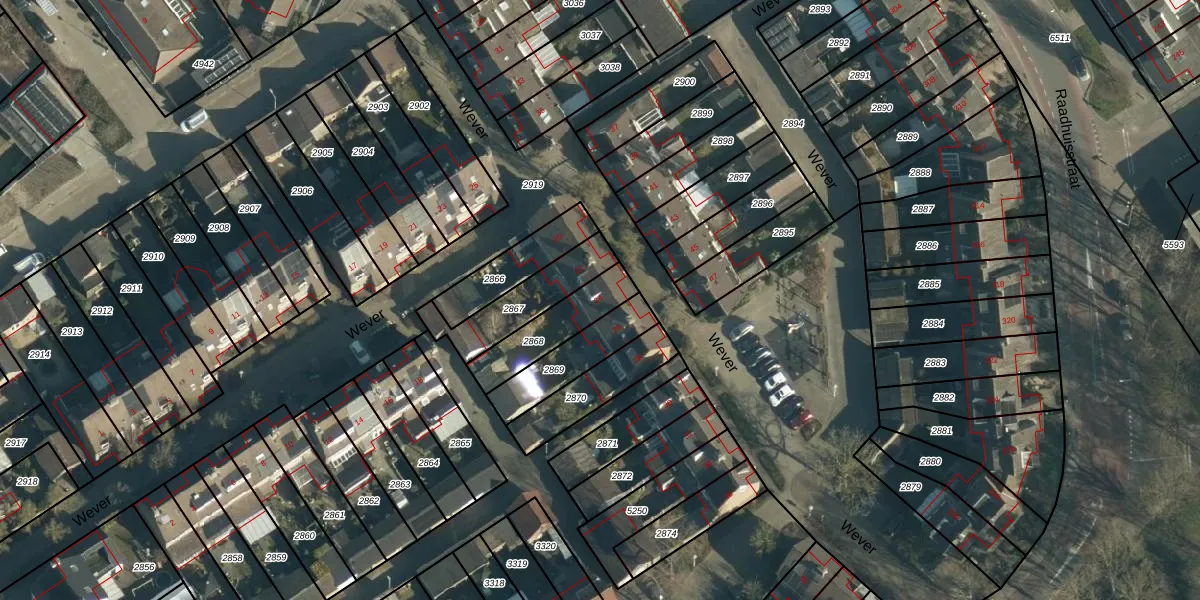 Het perceel waarop Wever 24 staat heeft een oppervlakte van 183 m². Dit is een middelgroot perceel. De perceeloppervlakte wordt geregistreerd door het Kadaster. Gedetailleerde informatie over de maten van dit perceel kunt u vinden in het rapport Kadastrale kaart met maatvoering van Wever 24.