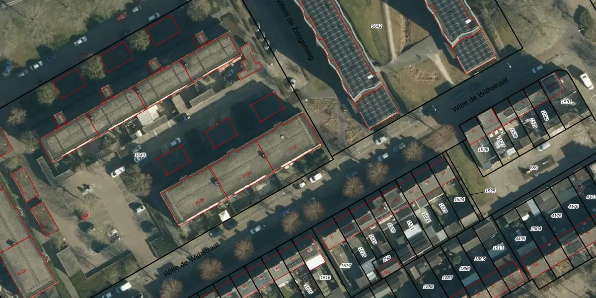 Het perceel waarop Witte de Withstraat 12 staat heeft een oppervlakte van 8353 m². Dit is een zeer groot perceel. De perceeloppervlakte wordt geregistreerd door het Kadaster. Gedetailleerde informatie over de maten van dit perceel kunt u vinden in het rapport Kadastrale kaart met maatvoering van Witte de Withstraat 12.