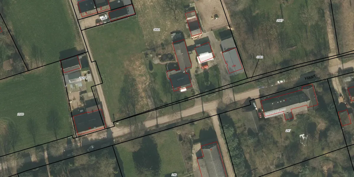 Het perceel waarop Haart 13-a staat heeft een oppervlakte van 6219 m². Dit is een zeer groot perceel. De perceeloppervlakte wordt geregistreerd door het Kadaster. Gedetailleerde informatie over de maten van dit perceel kunt u vinden in het rapport Kadastrale kaart met maatvoering van Haart 13-a.