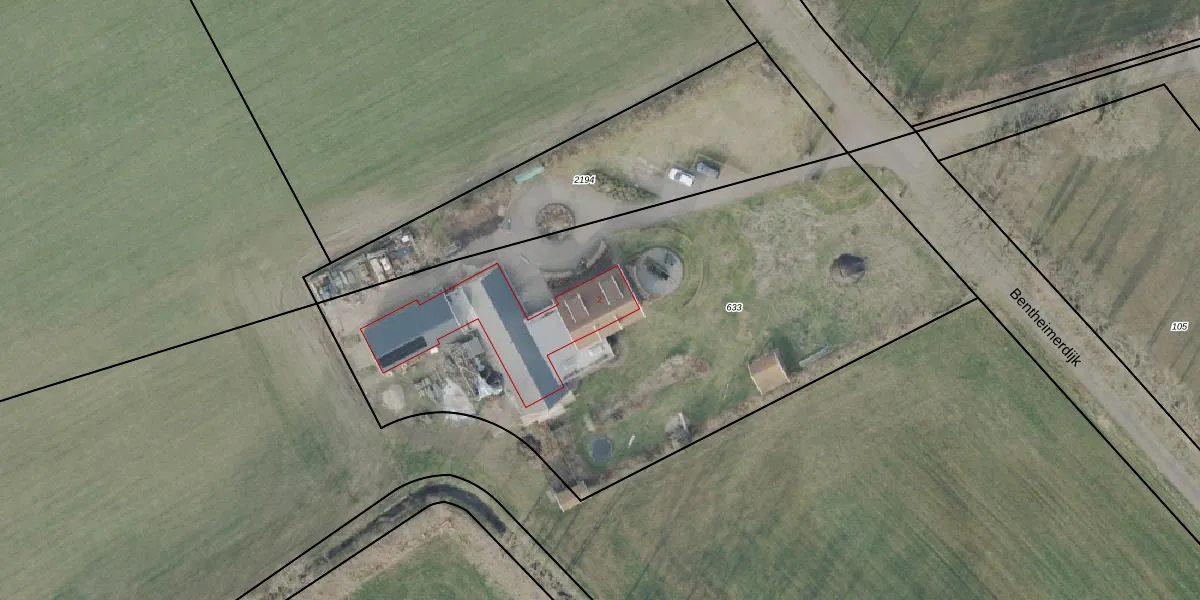 Bentheimerdijk 2 is gelegen op kadastraal perceel LSR00P633. Deze kadastrale aanduiding is uniek en wordt gebruikt door het Kadaster om eigendomsrechten en andere zakelijke rechten vast te leggen. Het perceel maakt onderdeel uit van de kadastrale gemeente Losser.