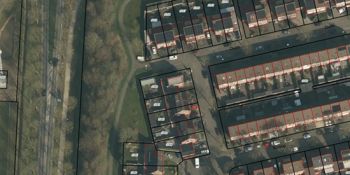 Het perceel waarop Duim 30 staat heeft een oppervlakte van 353 m². Dit is een groot perceel. De perceeloppervlakte wordt geregistreerd door het Kadaster. Gedetailleerde informatie over de maten van dit perceel kunt u vinden in het rapport Kadastrale kaart met maatvoering van Duim 30.