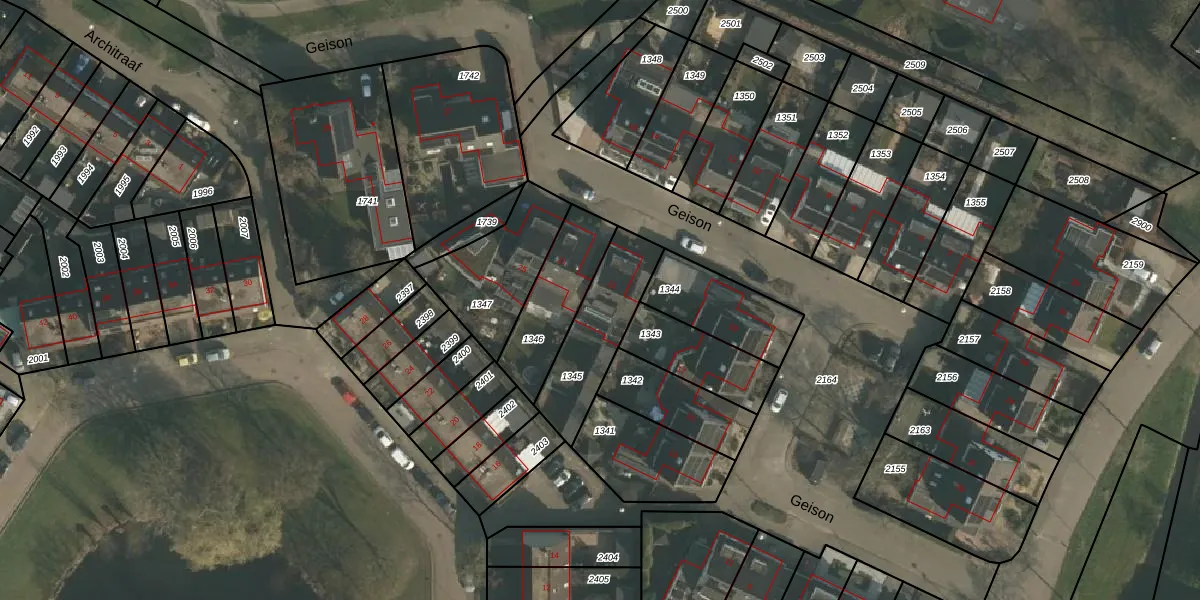 Het perceel waarop Geison 21 staat heeft een oppervlakte van 302 m². Dit is een groot perceel. De perceeloppervlakte wordt geregistreerd door het Kadaster. Gedetailleerde informatie over de maten van dit perceel kunt u vinden in het rapport Kadastrale kaart met maatvoering van Geison 21.