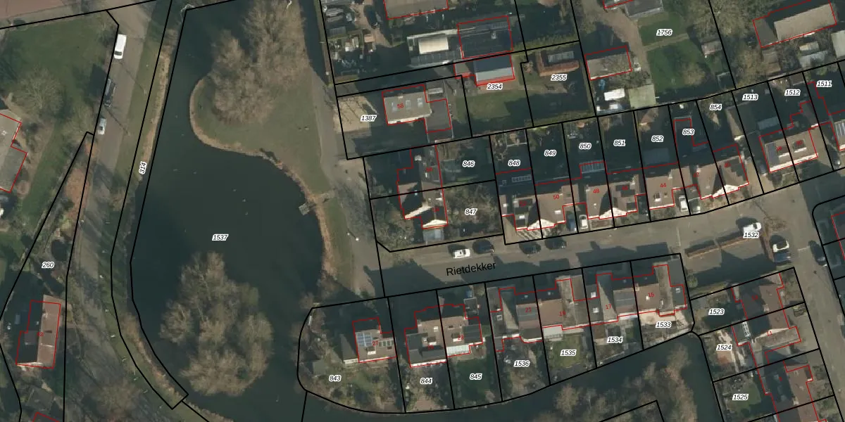 Het perceel waarop Rietdekker 54 staat heeft een oppervlakte van 388 m². Dit is een groot perceel. De perceeloppervlakte wordt geregistreerd door het Kadaster. Gedetailleerde informatie over de maten van dit perceel kunt u vinden in het rapport Kadastrale kaart met maatvoering van Rietdekker 54.