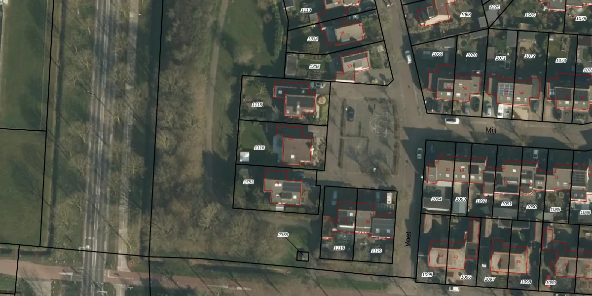 Het perceel waarop Voet 24 staat heeft een oppervlakte van 450 m². Dit is een groot perceel. De perceeloppervlakte wordt geregistreerd door het Kadaster. Gedetailleerde informatie over de maten van dit perceel kunt u vinden in het rapport Kadastrale kaart met maatvoering van Voet 24.