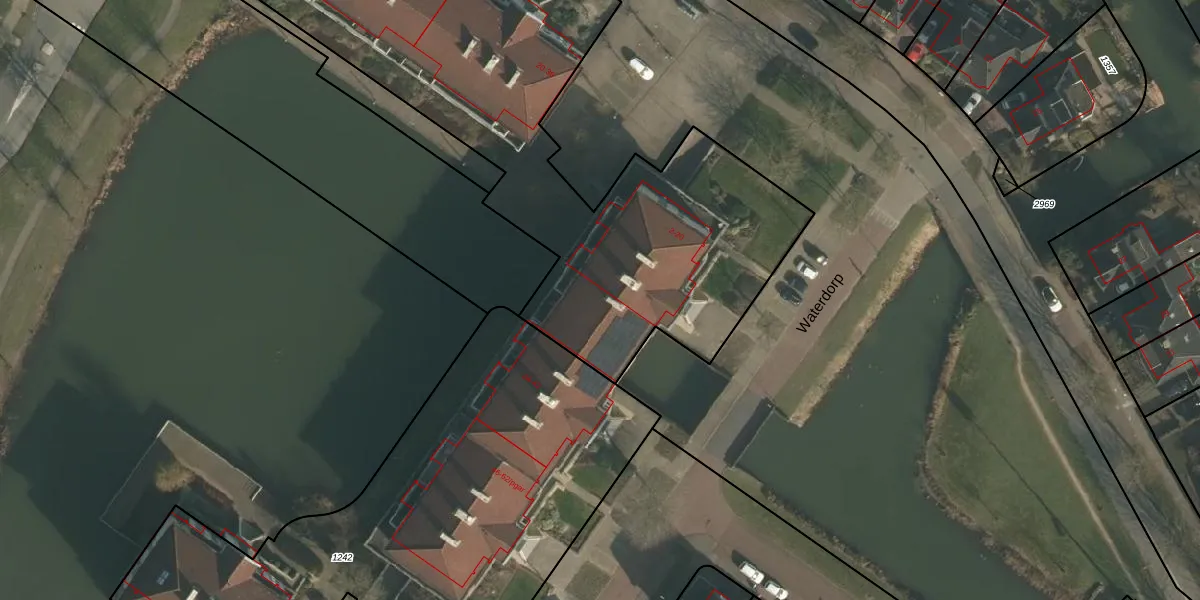 Het perceel waarop Waterdorp 16 staat heeft een oppervlakte van 3505 m². Dit is een zeer groot perceel. De perceeloppervlakte wordt geregistreerd door het Kadaster. Gedetailleerde informatie over de maten van dit perceel kunt u vinden in het rapport Kadastrale kaart met maatvoering van Waterdorp 16.