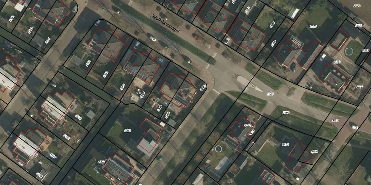 Het perceel waarop Wolfsbossingel 100 staat heeft een oppervlakte van 355 m². Dit is een groot perceel. De perceeloppervlakte wordt geregistreerd door het Kadaster. Gedetailleerde informatie over de maten van dit perceel kunt u vinden in het rapport Kadastrale kaart met maatvoering van Wolfsbossingel 100.