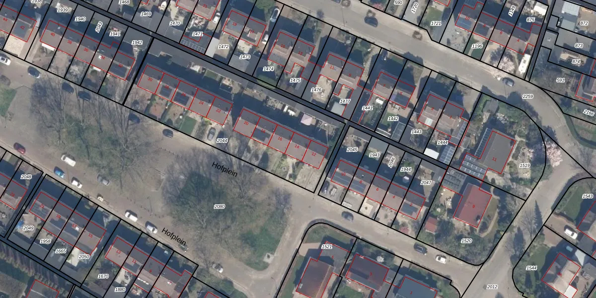 Het perceel waarop Hofplein 14 staat heeft een oppervlakte van 1837 m². Dit is een zeer groot perceel. De perceeloppervlakte wordt geregistreerd door het Kadaster. Gedetailleerde informatie over de maten van dit perceel kunt u vinden in het rapport Kadastrale kaart met maatvoering van Hofplein 14.
