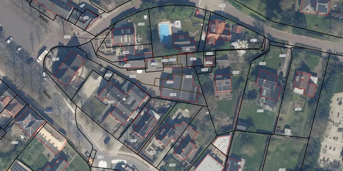 Het perceel waarop Markt 1-a staat heeft een oppervlakte van 108 m². Dit is een middelgroot perceel. De perceeloppervlakte wordt geregistreerd door het Kadaster. Gedetailleerde informatie over de maten van dit perceel kunt u vinden in het rapport Kadastrale kaart met maatvoering van Markt 1-a.
