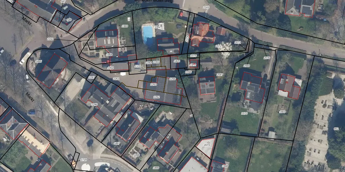 Het perceel waarop Markt 1-c staat heeft een oppervlakte van 198 m². Dit is een middelgroot perceel. De perceeloppervlakte wordt geregistreerd door het Kadaster. Gedetailleerde informatie over de maten van dit perceel kunt u vinden in het rapport Kadastrale kaart met maatvoering van Markt 1-c.