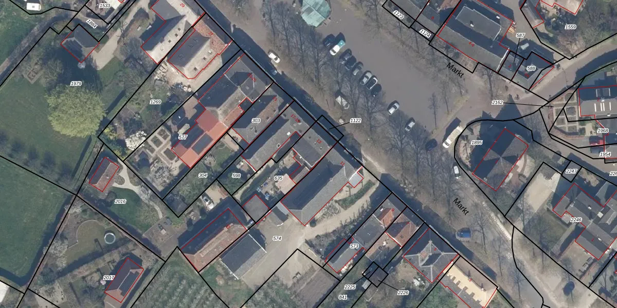 Het perceel waarop Markt 13 staat heeft een oppervlakte van 350 m². Dit is een groot perceel. De perceeloppervlakte wordt geregistreerd door het Kadaster. Gedetailleerde informatie over de maten van dit perceel kunt u vinden in het rapport Kadastrale kaart met maatvoering van Markt 13.