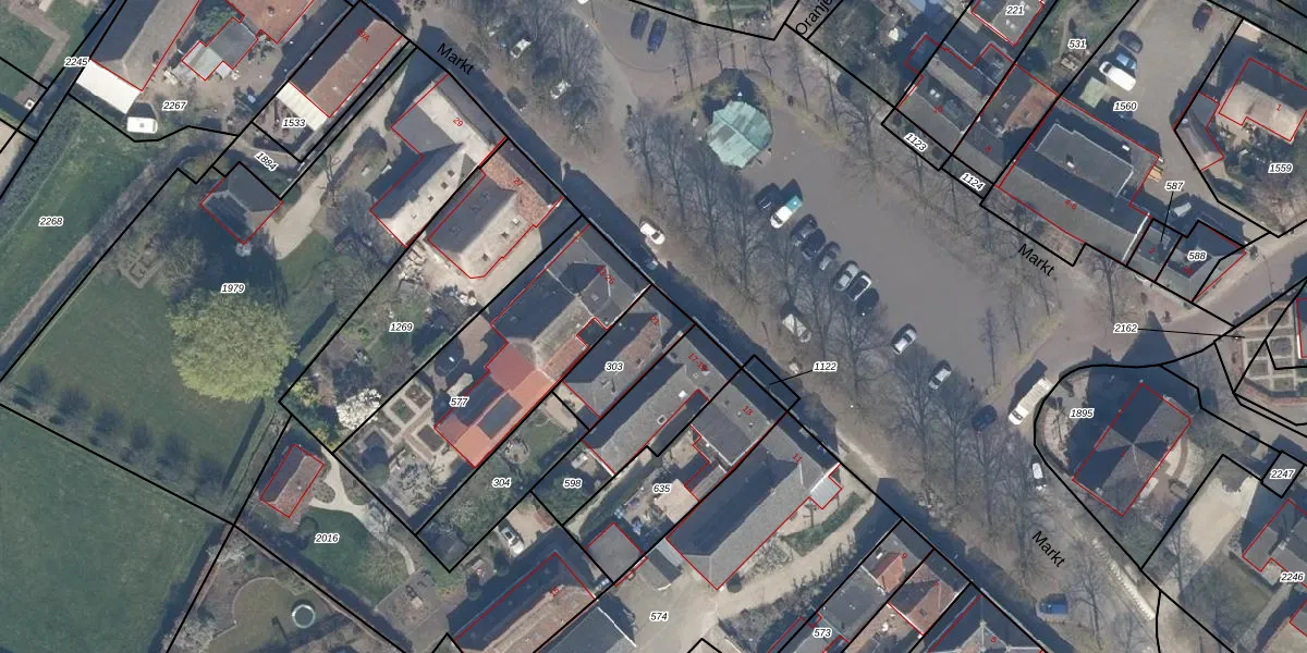 Het perceel waarop Markt 21 staat heeft een oppervlakte van 184 m². Dit is een middelgroot perceel. De perceeloppervlakte wordt geregistreerd door het Kadaster. Gedetailleerde informatie over de maten van dit perceel kunt u vinden in het rapport Kadastrale kaart met maatvoering van Markt 21.