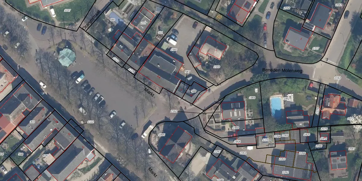 Het perceel waarop Markt 4 staat heeft een oppervlakte van 44 m². Dit is een klein perceel. De perceeloppervlakte wordt geregistreerd door het Kadaster. Gedetailleerde informatie over de maten van dit perceel kunt u vinden in het rapport Kadastrale kaart met maatvoering van Markt 4.