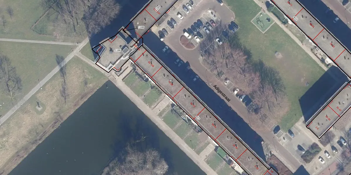 Het perceel waarop Adigestraat 80 staat heeft een oppervlakte van 1168 m². Dit is een zeer groot perceel. De perceeloppervlakte wordt geregistreerd door het Kadaster. Gedetailleerde informatie over de maten van dit perceel kunt u vinden in het rapport Kadastrale kaart met maatvoering van Adigestraat 80.