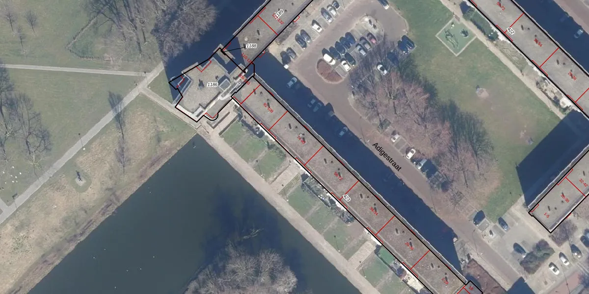 Het perceel waarop Adigestraat 88 staat heeft een oppervlakte van 1168 m². Dit is een zeer groot perceel. De perceeloppervlakte wordt geregistreerd door het Kadaster. Gedetailleerde informatie over de maten van dit perceel kunt u vinden in het rapport Kadastrale kaart met maatvoering van Adigestraat 88.