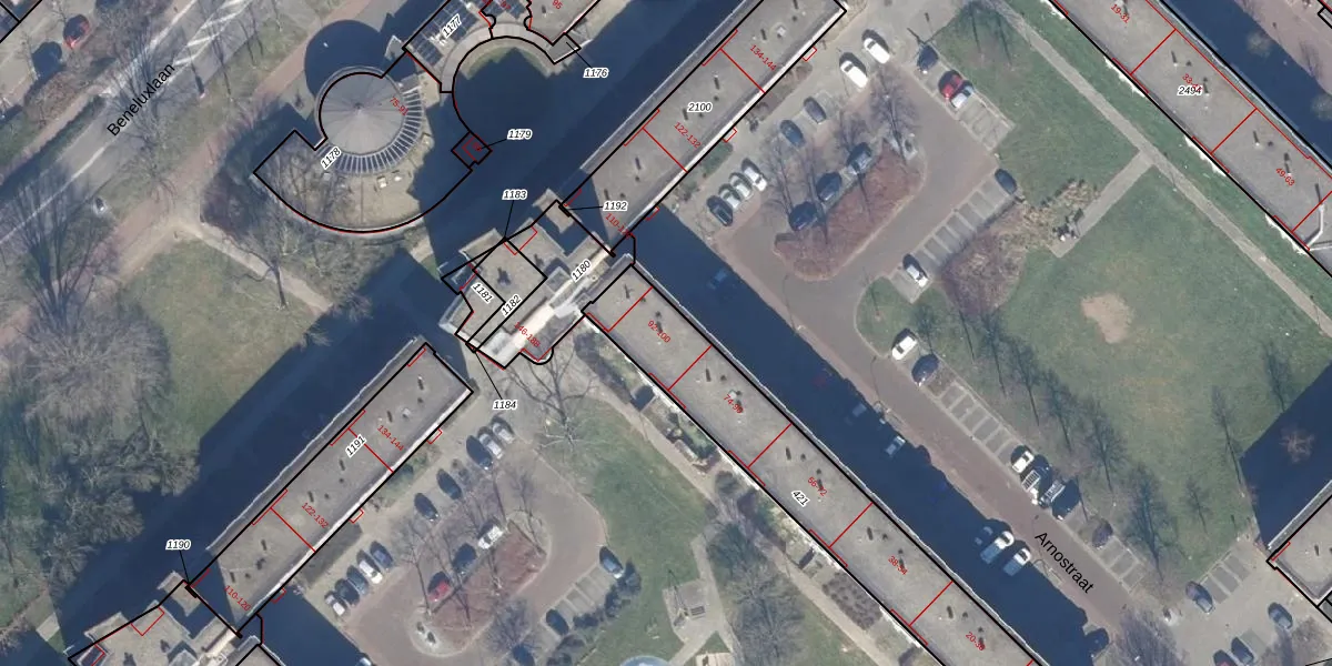 Het perceel waarop Arnostraat 100 staat heeft een oppervlakte van 1489 m². Dit is een zeer groot perceel. De perceeloppervlakte wordt geregistreerd door het Kadaster. Gedetailleerde informatie over de maten van dit perceel kunt u vinden in het rapport Kadastrale kaart met maatvoering van Arnostraat 100.