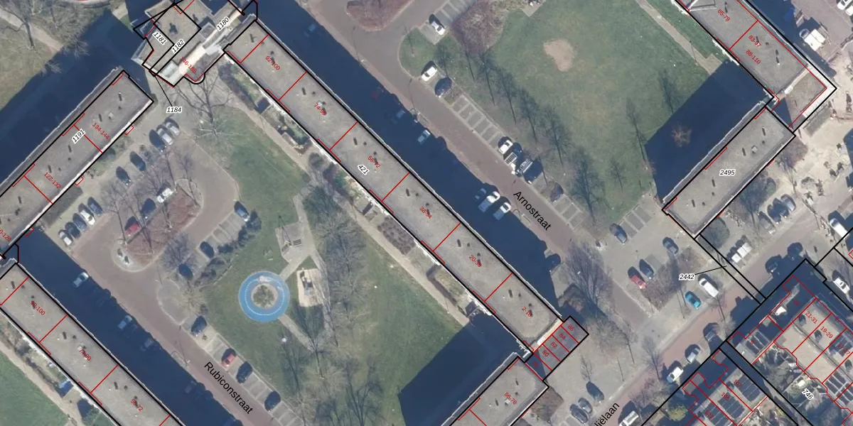 Het perceel waarop Arnostraat 46 staat heeft een oppervlakte van 1489 m². Dit is een zeer groot perceel. De perceeloppervlakte wordt geregistreerd door het Kadaster. Gedetailleerde informatie over de maten van dit perceel kunt u vinden in het rapport Kadastrale kaart met maatvoering van Arnostraat 46.