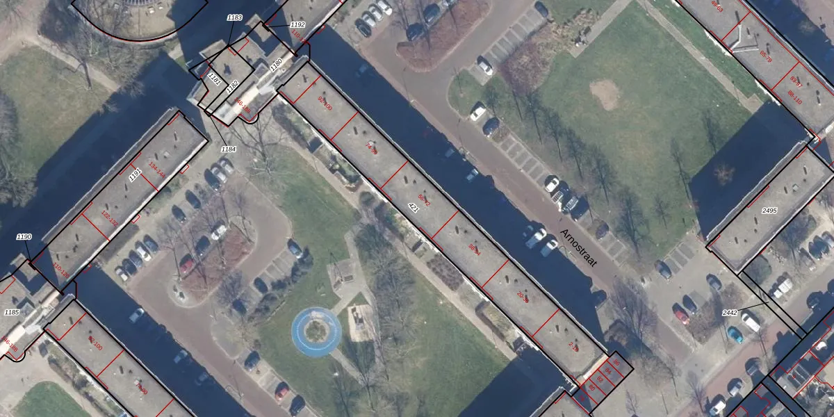 Het perceel waarop Arnostraat 70 staat heeft een oppervlakte van 1489 m². Dit is een zeer groot perceel. De perceeloppervlakte wordt geregistreerd door het Kadaster. Gedetailleerde informatie over de maten van dit perceel kunt u vinden in het rapport Kadastrale kaart met maatvoering van Arnostraat 70.