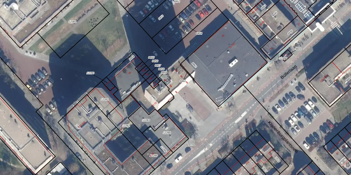 Het perceel waarop Büllerlaan 38 staat heeft een oppervlakte van 5,7 ha. Dit is een zeer groot perceel. De perceeloppervlakte wordt geregistreerd door het Kadaster. Gedetailleerde informatie over de maten van dit perceel kunt u vinden in het rapport Kadastrale kaart met maatvoering van Büllerlaan 38.