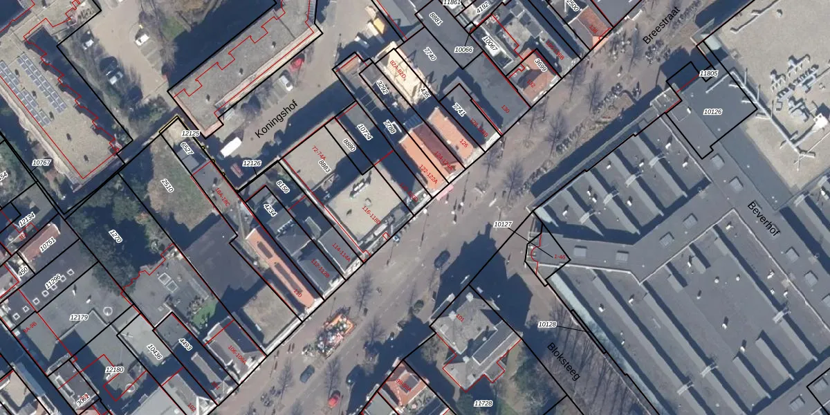Het perceel waarop Breestraat 120 staat heeft een oppervlakte van 190 m². Dit is een middelgroot perceel. De perceeloppervlakte wordt geregistreerd door het Kadaster. Gedetailleerde informatie over de maten van dit perceel kunt u vinden in het rapport Kadastrale kaart met maatvoering van Breestraat 120.