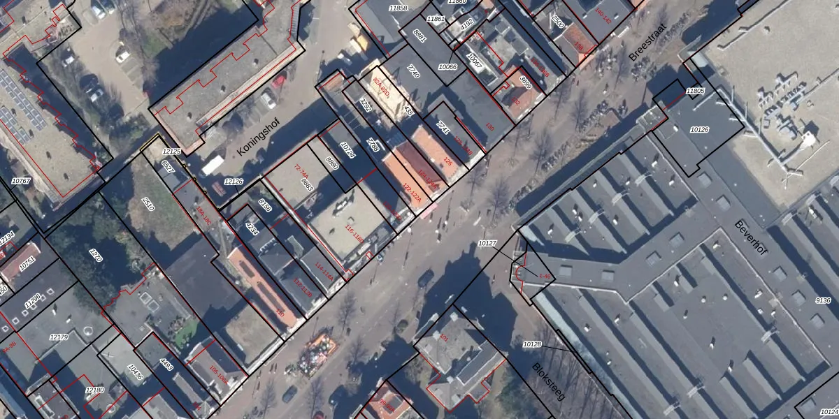 Het perceel waarop Breestraat 122 staat heeft een oppervlakte van 194 m². Dit is een middelgroot perceel. De perceeloppervlakte wordt geregistreerd door het Kadaster. Gedetailleerde informatie over de maten van dit perceel kunt u vinden in het rapport Kadastrale kaart met maatvoering van Breestraat 122.