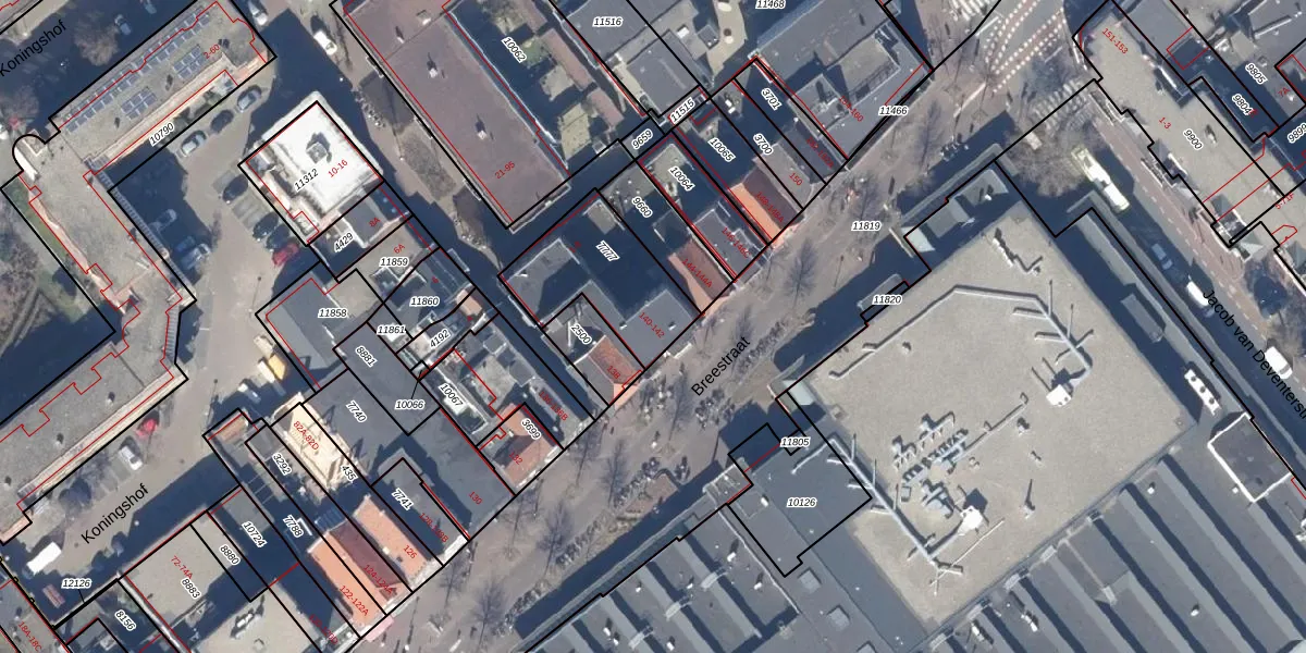 Het perceel waarop Breestraat 142 staat heeft een oppervlakte van 385 m². Dit is een groot perceel. De perceeloppervlakte wordt geregistreerd door het Kadaster. Gedetailleerde informatie over de maten van dit perceel kunt u vinden in het rapport Kadastrale kaart met maatvoering van Breestraat 142.