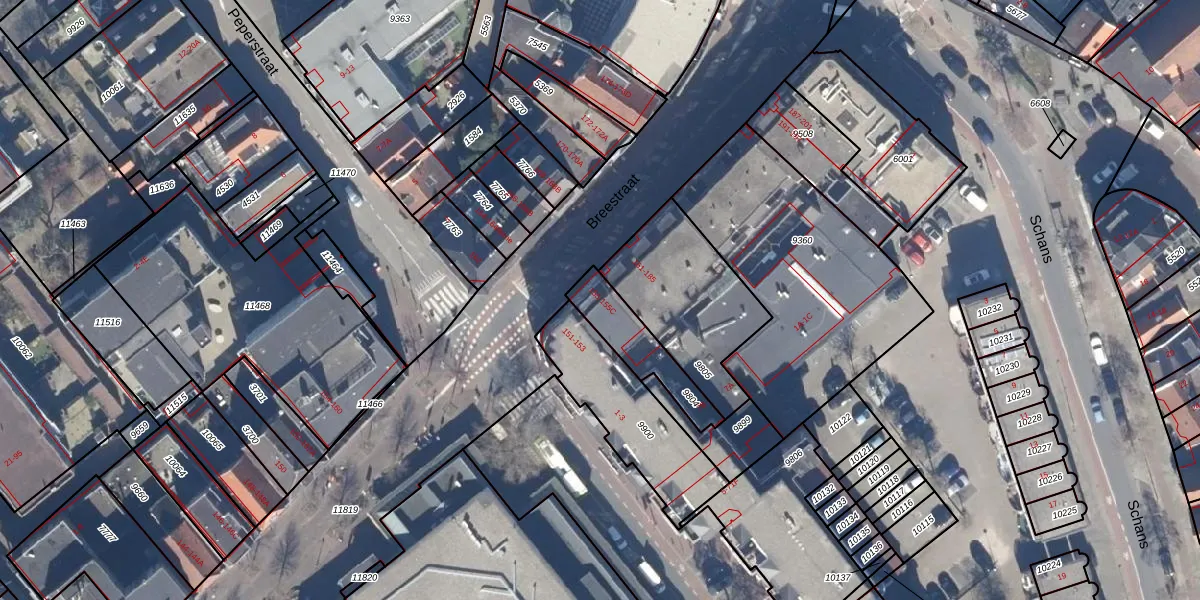 Het perceel waarop Breestraat 155-A staat heeft een oppervlakte van 186 m². Dit is een middelgroot perceel. De perceeloppervlakte wordt geregistreerd door het Kadaster. Gedetailleerde informatie over de maten van dit perceel kunt u vinden in het rapport Kadastrale kaart met maatvoering van Breestraat 155-A.