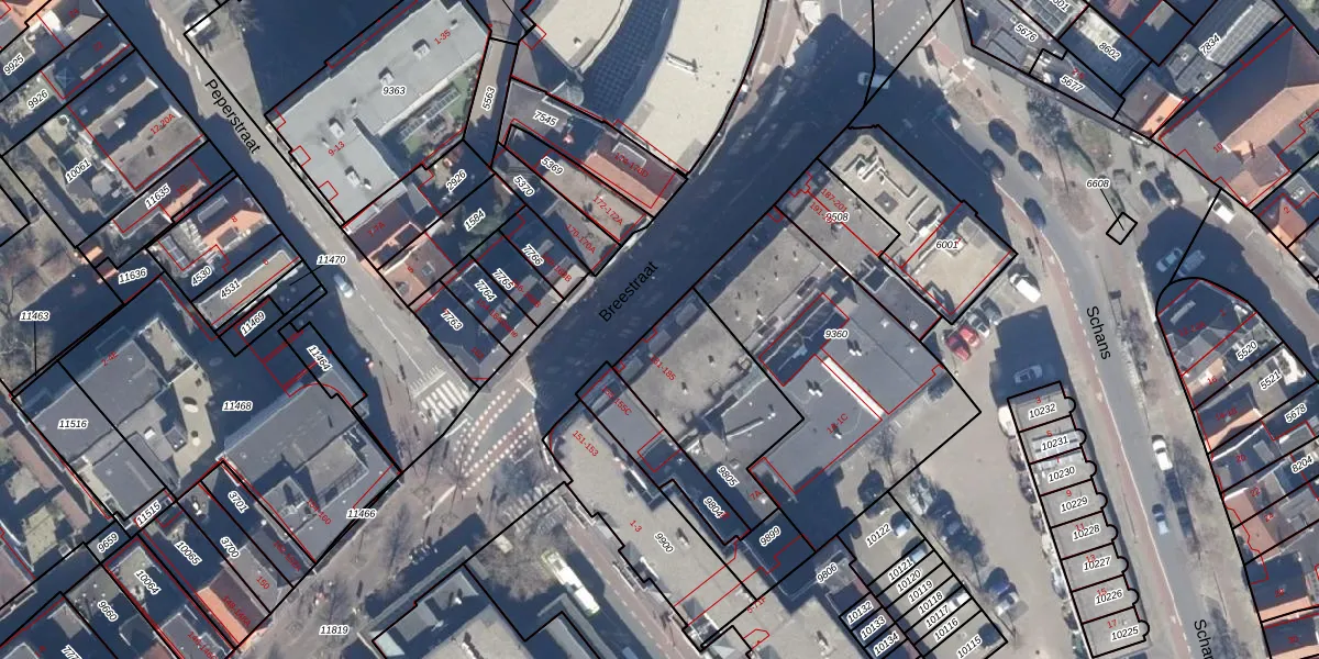 Het perceel waarop Breestraat 169 staat heeft een oppervlakte van 496 m². Dit is een groot perceel. De perceeloppervlakte wordt geregistreerd door het Kadaster. Gedetailleerde informatie over de maten van dit perceel kunt u vinden in het rapport Kadastrale kaart met maatvoering van Breestraat 169.