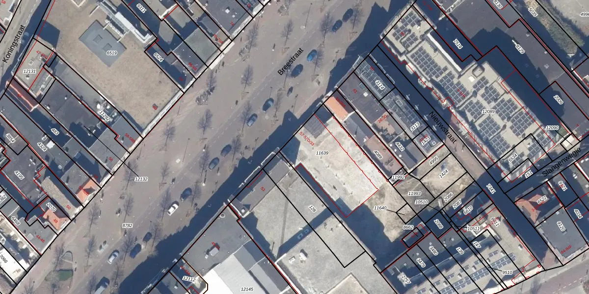 Het perceel waarop Breestraat 57 staat heeft een oppervlakte van 1170 m². Dit is een zeer groot perceel. De perceeloppervlakte wordt geregistreerd door het Kadaster. Gedetailleerde informatie over de maten van dit perceel kunt u vinden in het rapport Kadastrale kaart met maatvoering van Breestraat 57.