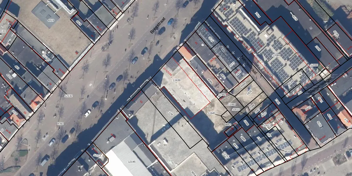 Het perceel waarop Breestraat 57-D-31 staat heeft een oppervlakte van 1170 m². Dit is een zeer groot perceel. De perceeloppervlakte wordt geregistreerd door het Kadaster. Gedetailleerde informatie over de maten van dit perceel kunt u vinden in het rapport Kadastrale kaart met maatvoering van Breestraat 57-D-31.