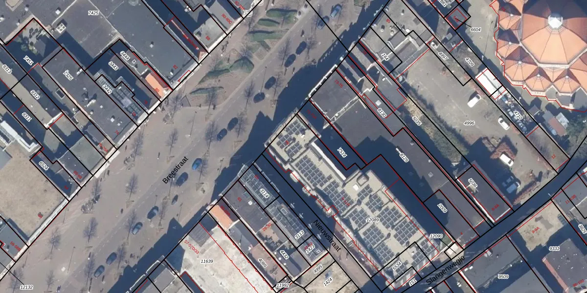 Het perceel waarop Breestraat 65 staat heeft een oppervlakte van 1556 m². Dit is een zeer groot perceel. De perceeloppervlakte wordt geregistreerd door het Kadaster. Gedetailleerde informatie over de maten van dit perceel kunt u vinden in het rapport Kadastrale kaart met maatvoering van Breestraat 65.