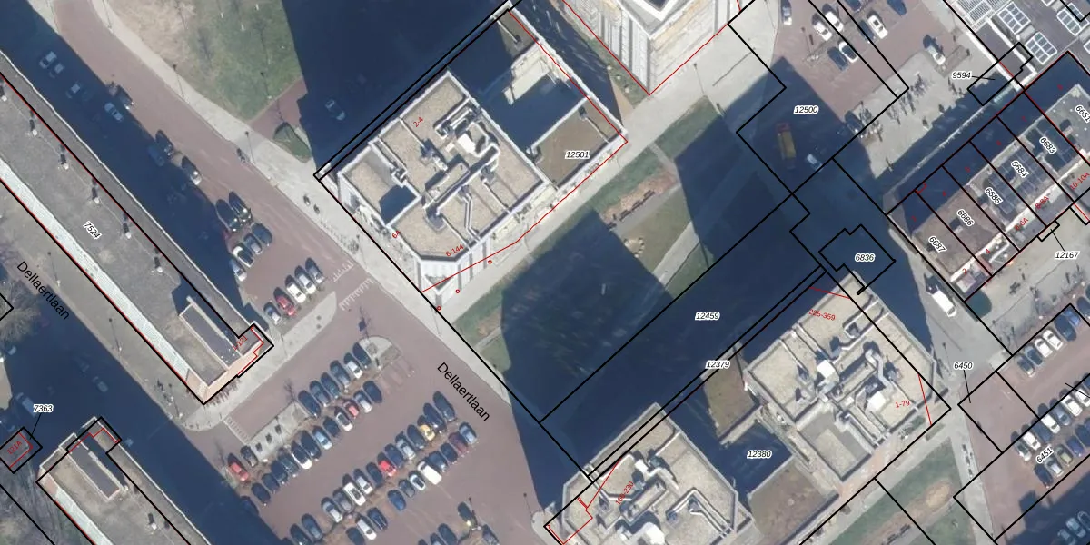 Het perceel waarop Dellaertlaan 96 staat heeft een oppervlakte van 4553 m². Dit is een zeer groot perceel. De perceeloppervlakte wordt geregistreerd door het Kadaster. Gedetailleerde informatie over de maten van dit perceel kunt u vinden in het rapport Kadastrale kaart met maatvoering van Dellaertlaan 96.