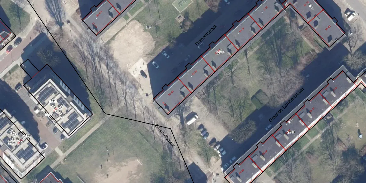 Het perceel waarop Dumontstraat 78 staat heeft een oppervlakte van 1494 m². Dit is een zeer groot perceel. De perceeloppervlakte wordt geregistreerd door het Kadaster. Gedetailleerde informatie over de maten van dit perceel kunt u vinden in het rapport Kadastrale kaart met maatvoering van Dumontstraat 78.