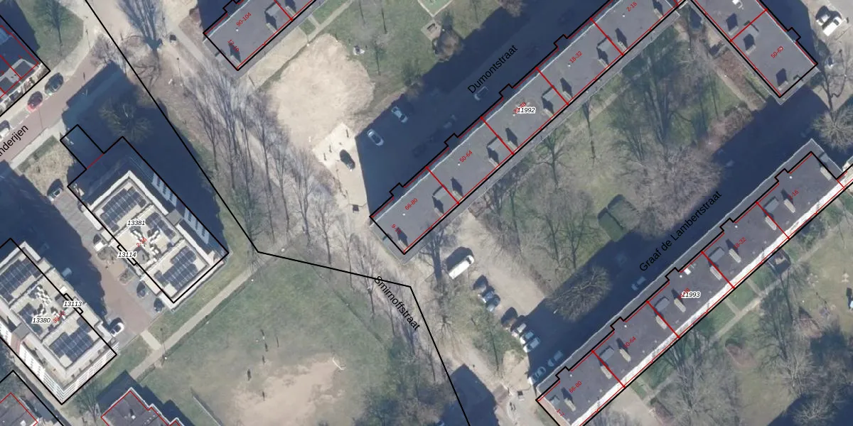 Het perceel waarop Dumontstraat 80 staat heeft een oppervlakte van 1494 m². Dit is een zeer groot perceel. De perceeloppervlakte wordt geregistreerd door het Kadaster. Gedetailleerde informatie over de maten van dit perceel kunt u vinden in het rapport Kadastrale kaart met maatvoering van Dumontstraat 80.