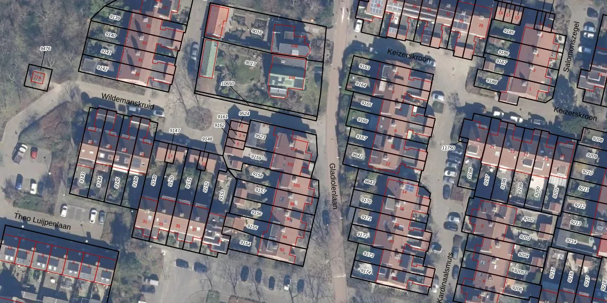 Het perceel waarop Gladiolenlaan 104 staat heeft een oppervlakte van 208 m². Dit is een middelgroot perceel. De perceeloppervlakte wordt geregistreerd door het Kadaster. Gedetailleerde informatie over de maten van dit perceel kunt u vinden in het rapport Kadastrale kaart met maatvoering van Gladiolenlaan 104.