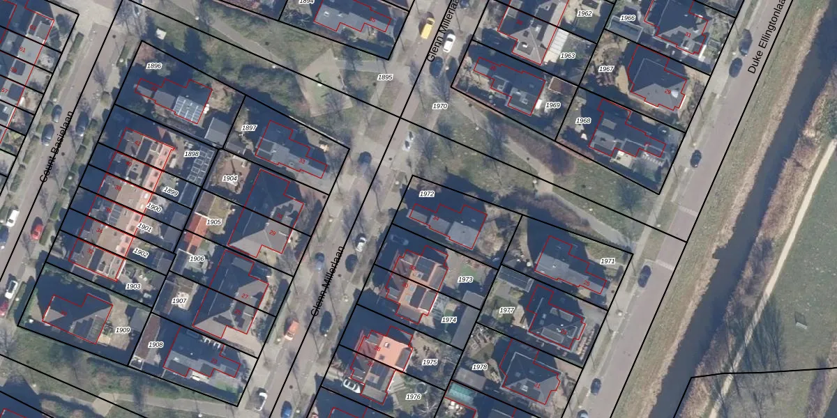 Het perceel waarop Glenn Millerlaan 34 staat heeft een oppervlakte van 375 m². Dit is een groot perceel. De perceeloppervlakte wordt geregistreerd door het Kadaster. Gedetailleerde informatie over de maten van dit perceel kunt u vinden in het rapport Kadastrale kaart met maatvoering van Glenn Millerlaan 34.