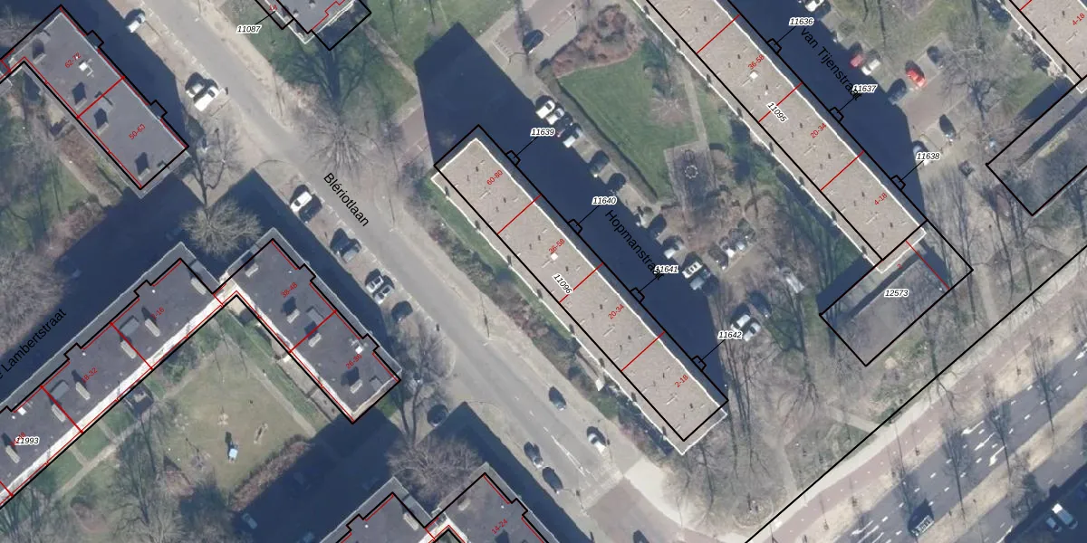 Het perceel waarop Hopmanstraat 56 staat heeft een oppervlakte van 758 m². Dit is een groot perceel. De perceeloppervlakte wordt geregistreerd door het Kadaster. Gedetailleerde informatie over de maten van dit perceel kunt u vinden in het rapport Kadastrale kaart met maatvoering van Hopmanstraat 56.