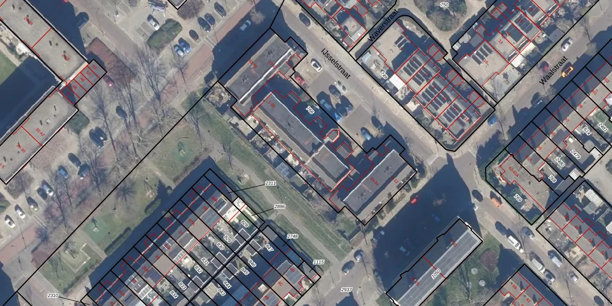 Het perceel waarop IJsselstraat 55 staat heeft een oppervlakte van 1596 m². Dit is een zeer groot perceel. De perceeloppervlakte wordt geregistreerd door het Kadaster. Gedetailleerde informatie over de maten van dit perceel kunt u vinden in het rapport Kadastrale kaart met maatvoering van IJsselstraat 55.