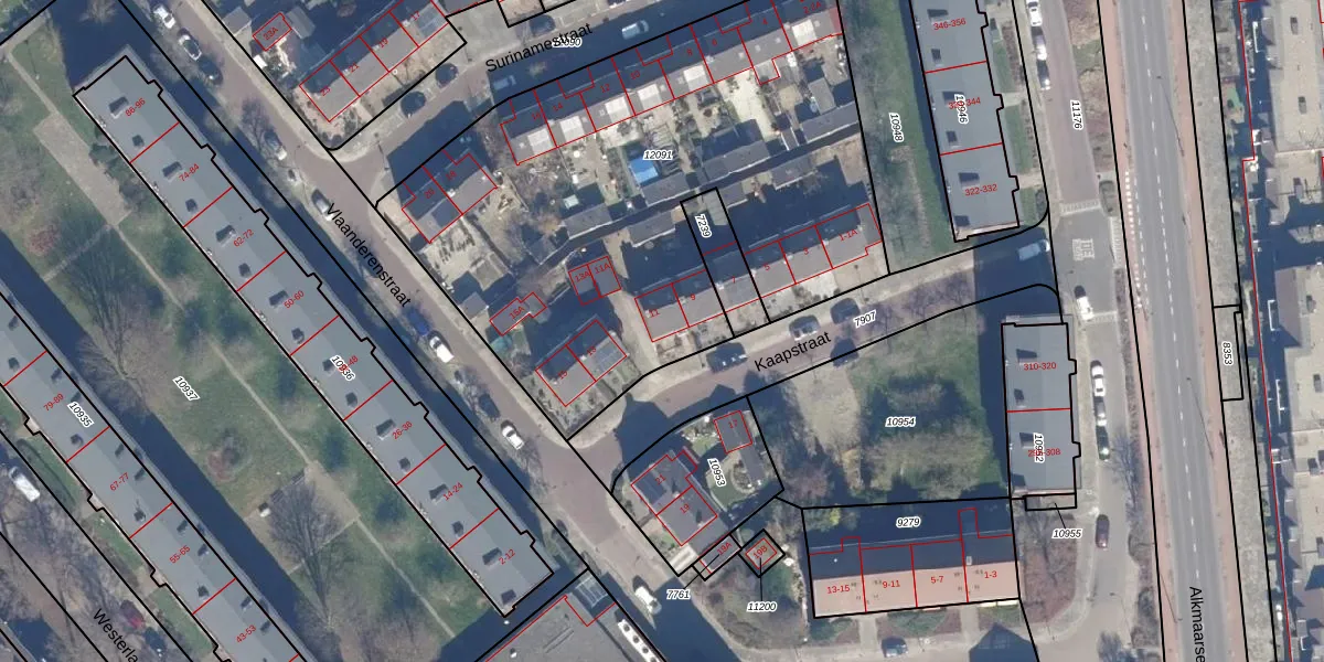 Het perceel waarop Kaapstraat 11 staat heeft een oppervlakte van 2975 m². Dit is een zeer groot perceel. De perceeloppervlakte wordt geregistreerd door het Kadaster. Gedetailleerde informatie over de maten van dit perceel kunt u vinden in het rapport Kadastrale kaart met maatvoering van Kaapstraat 11.