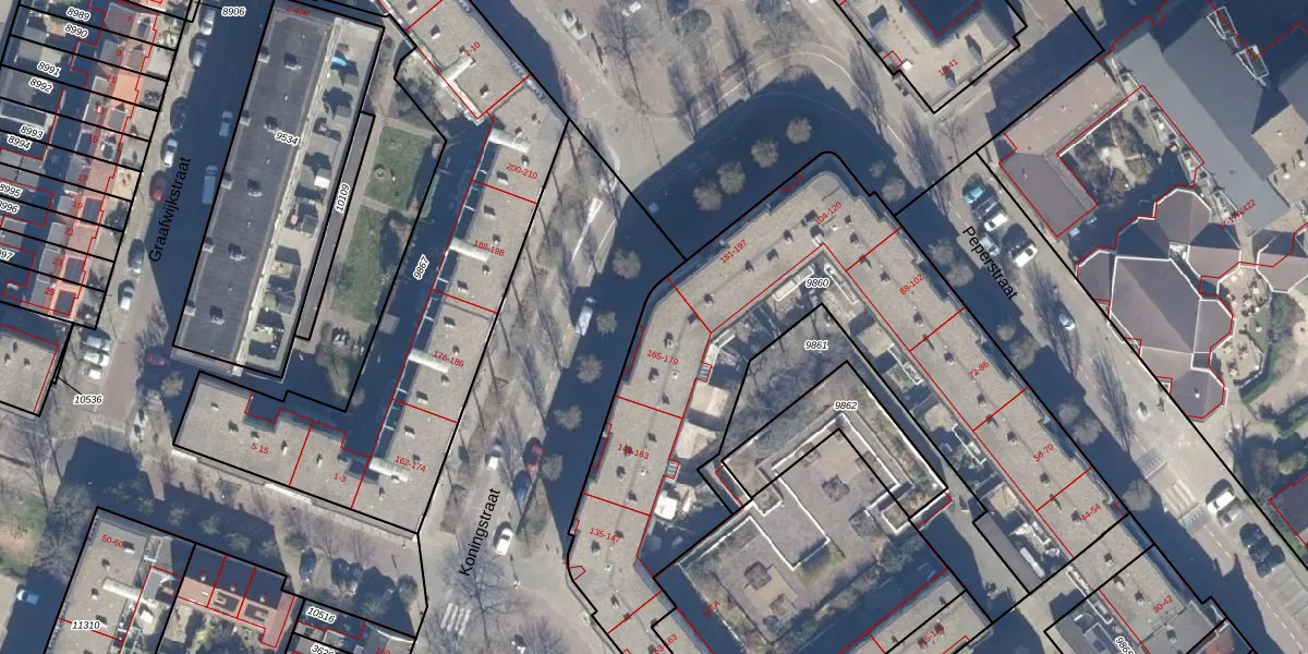 Het perceel waarop Koningstraat 165 staat heeft een oppervlakte van 2432 m². Dit is een zeer groot perceel. De perceeloppervlakte wordt geregistreerd door het Kadaster. Gedetailleerde informatie over de maten van dit perceel kunt u vinden in het rapport Kadastrale kaart met maatvoering van Koningstraat 165.