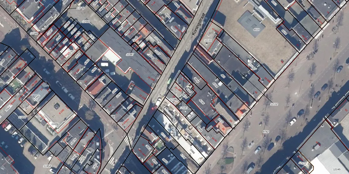 Het perceel waarop Koningstraat 35 staat heeft een oppervlakte van 67 m². Dit is een klein perceel. De perceeloppervlakte wordt geregistreerd door het Kadaster. Gedetailleerde informatie over de maten van dit perceel kunt u vinden in het rapport Kadastrale kaart met maatvoering van Koningstraat 35.