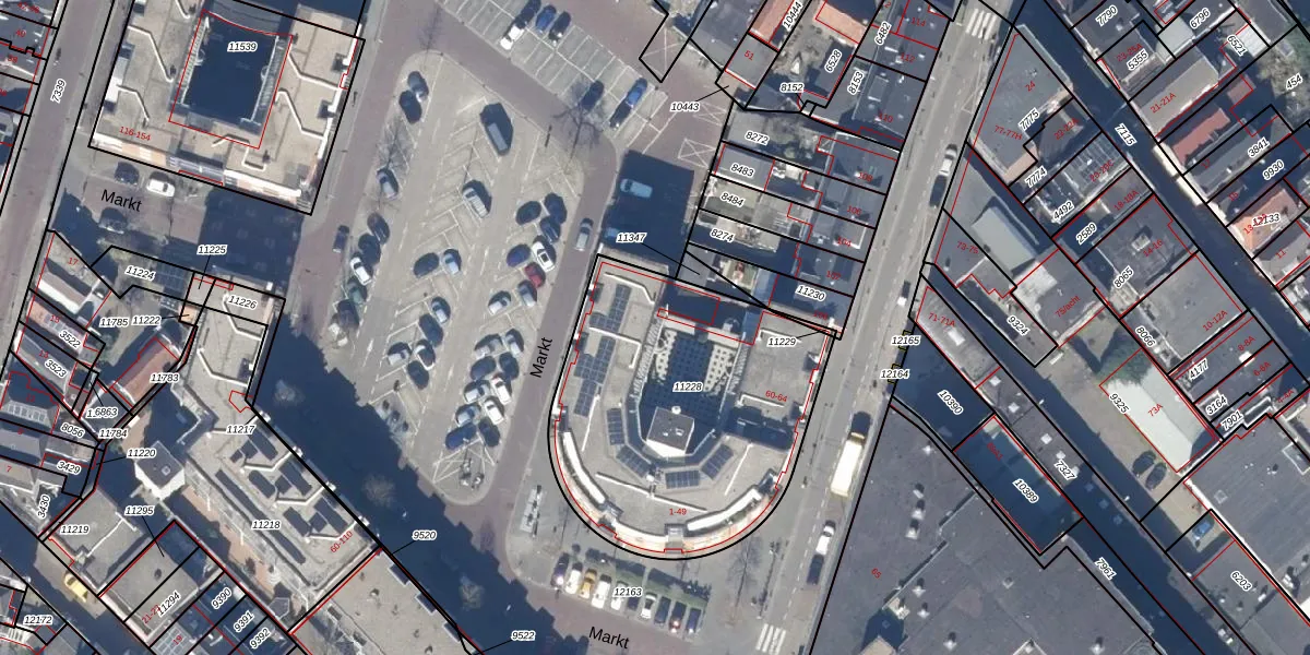 Het perceel waarop Markt 1 staat heeft een oppervlakte van 1415 m². Dit is een zeer groot perceel. De perceeloppervlakte wordt geregistreerd door het Kadaster. Gedetailleerde informatie over de maten van dit perceel kunt u vinden in het rapport Kadastrale kaart met maatvoering van Markt 1.