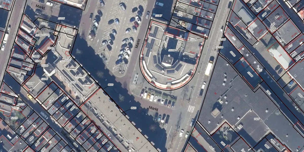 Het perceel waarop Markt 19 staat heeft een oppervlakte van 1415 m². Dit is een zeer groot perceel. De perceeloppervlakte wordt geregistreerd door het Kadaster. Gedetailleerde informatie over de maten van dit perceel kunt u vinden in het rapport Kadastrale kaart met maatvoering van Markt 19.