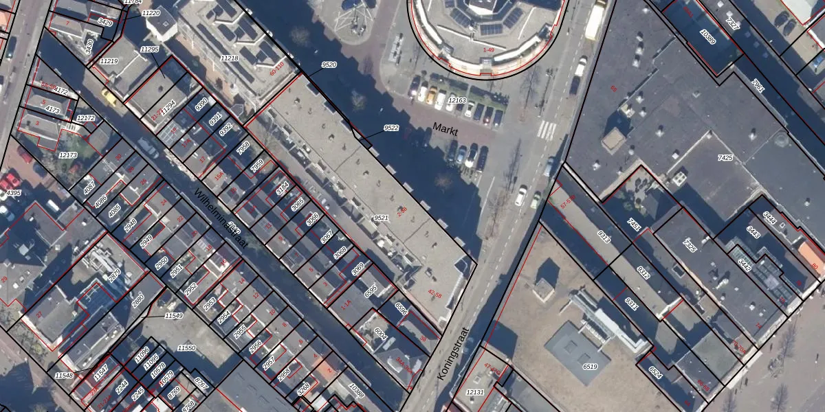 Het perceel waarop Markt 56 staat heeft een oppervlakte van 1242 m². Dit is een zeer groot perceel. De perceeloppervlakte wordt geregistreerd door het Kadaster. Gedetailleerde informatie over de maten van dit perceel kunt u vinden in het rapport Kadastrale kaart met maatvoering van Markt 56.