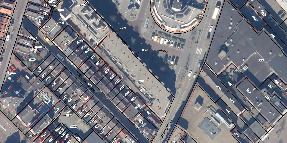 Het perceel waarop Markt 8 staat heeft een oppervlakte van 1242 m². Dit is een zeer groot perceel. De perceeloppervlakte wordt geregistreerd door het Kadaster. Gedetailleerde informatie over de maten van dit perceel kunt u vinden in het rapport Kadastrale kaart met maatvoering van Markt 8.