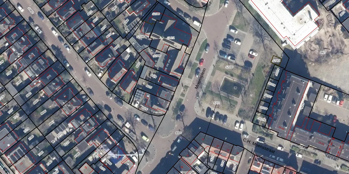 Het perceel waarop Moensplein 6 staat heeft een oppervlakte van 165 m². Dit is een middelgroot perceel. De perceeloppervlakte wordt geregistreerd door het Kadaster. Gedetailleerde informatie over de maten van dit perceel kunt u vinden in het rapport Kadastrale kaart met maatvoering van Moensplein 6.