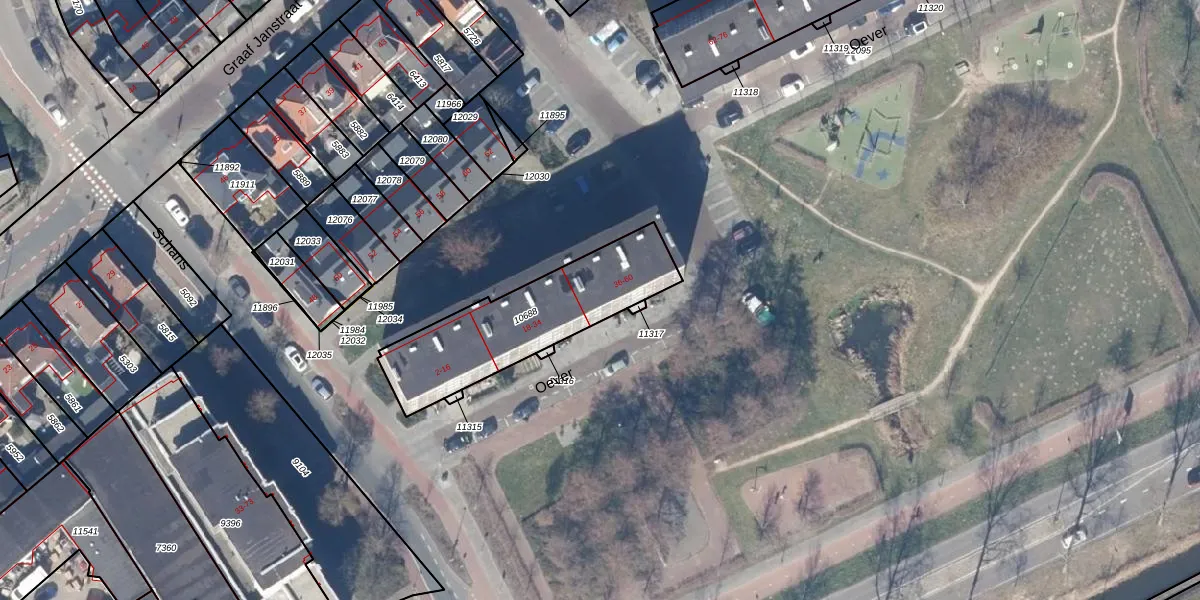 Het perceel waarop Oever 44 staat heeft een oppervlakte van 582 m². Dit is een groot perceel. De perceeloppervlakte wordt geregistreerd door het Kadaster. Gedetailleerde informatie over de maten van dit perceel kunt u vinden in het rapport Kadastrale kaart met maatvoering van Oever 44.