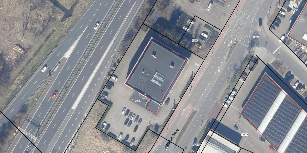 Het perceel waarop Parallelweg 2-B staat heeft een oppervlakte van 3195 m². Dit is een zeer groot perceel. De perceeloppervlakte wordt geregistreerd door het Kadaster. Gedetailleerde informatie over de maten van dit perceel kunt u vinden in het rapport Kadastrale kaart met maatvoering van Parallelweg 2-B.