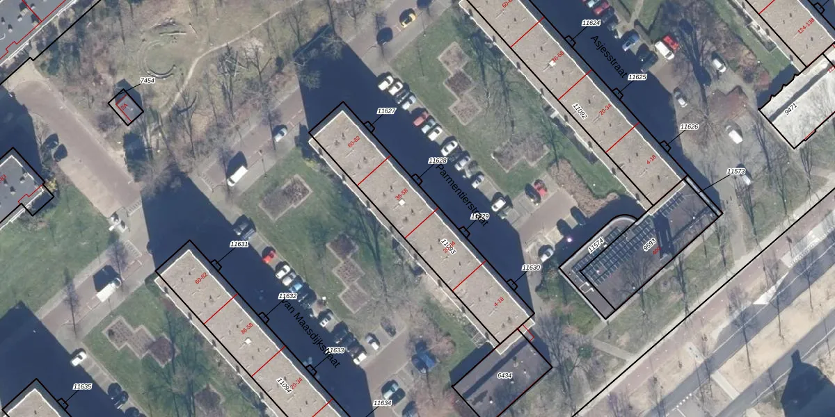 Het perceel waarop Parmentierstraat 42 staat heeft een oppervlakte van 758 m². Dit is een groot perceel. De perceeloppervlakte wordt geregistreerd door het Kadaster. Gedetailleerde informatie over de maten van dit perceel kunt u vinden in het rapport Kadastrale kaart met maatvoering van Parmentierstraat 42.