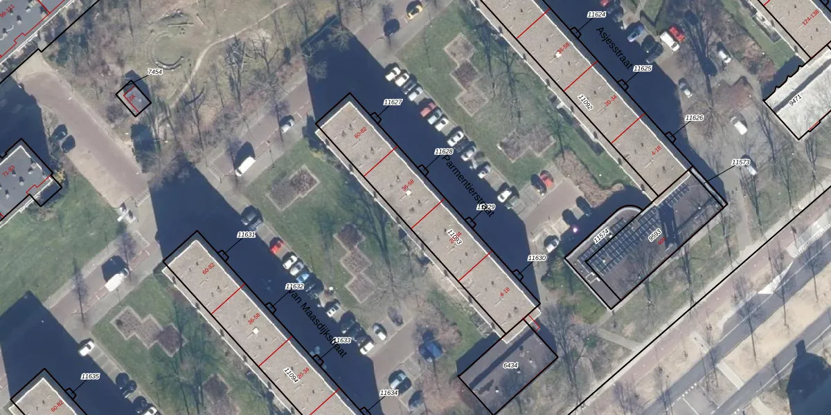 Het perceel waarop Parmentierstraat 48 staat heeft een oppervlakte van 758 m². Dit is een groot perceel. De perceeloppervlakte wordt geregistreerd door het Kadaster. Gedetailleerde informatie over de maten van dit perceel kunt u vinden in het rapport Kadastrale kaart met maatvoering van Parmentierstraat 48.
